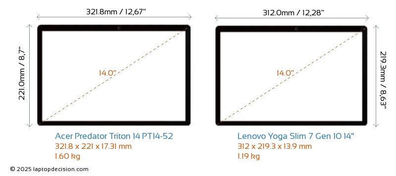 HDMI両方の Predator Triton 14 PT14-52 と Yoga Slim 7 Gen 10 14" は、外部モニターに接続するための HDMI ポート (1x HDMI 2.1) を備えています。