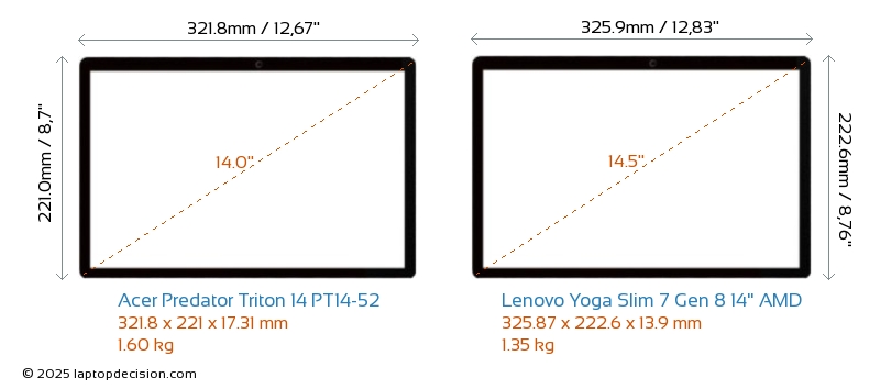 HDMI Predator Triton 14 PT14-52 は、外部モニターに接続するための HDMI ポート (1x HDMI 2.1) を備えています。 Yoga Slim 7 Gen 8 14" AMD には HDMI ポートがありません。