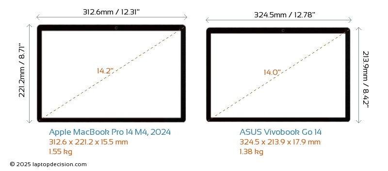HDMIどちらの MacBook Pro 14 M4, 2024 と Vivobook Go 14 も HDMI ポートを備えています。 MacBook Pro 14 M4, 2024 は 1x HDMI 2.1 を提供し、 Vivobook Go 14 は 1x HDMI 1.4 を提供します。