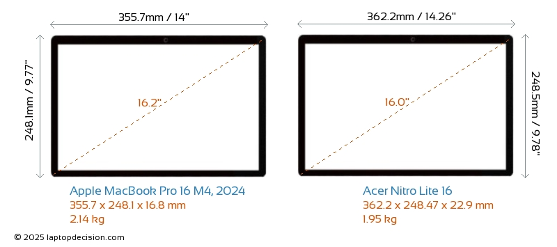 HDMI両方の MacBook Pro 16 M4, 2024 と Nitro Lite 16 は、外部モニターに接続するための HDMI ポート (1x HDMI 2.1) を備えています。