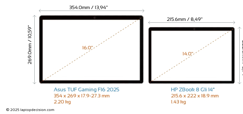 HDMI両方の TUF Gaming F16 2025 と ZBook 8 G1i 14" は、外部モニターに接続するための HDMI ポート (1x HDMI 2.1) を備えています。