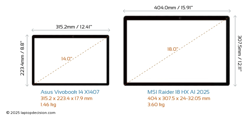 HDMIどちらの Vivobook 14 X1407 と Raider 18 HX AI 2025 も HDMI ポートを備えています。 Vivobook 14 X1407 は 1x HDMI 1.4 を提供し、 Raider 18 HX AI 2025 は 1x HDMI 2.1 を提供します。