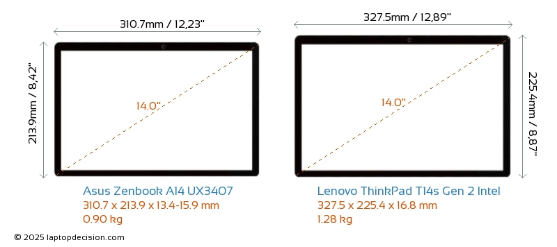 HDMIどちらの Zenbook A14 UX3407 と ThinkPad T14s Gen 2 Intel も HDMI ポートを備えています。 Zenbook A14 UX3407 は 1x HDMI 2.1 を提供し、ThinkPad T14s Gen 2 Intel は 1x HDMI 2.0 を提供します。