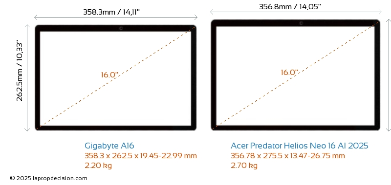 HDMI両方の A16 と Predator Helios Neo 16 AI 2025 は、外部モニターに接続するための HDMI ポート (1x HDMI 2.1) を備えています。