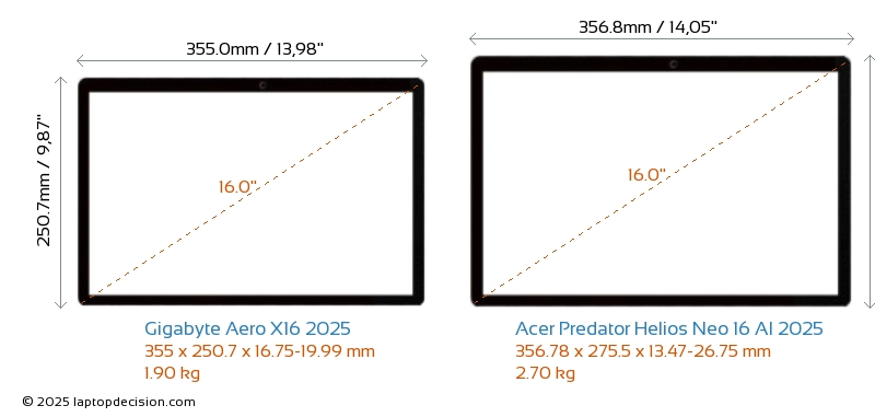 USB両方の Aero X16 2025 と Predator Helios Neo 16 AI 2025 は、3x USB 3.2 の USB-A ポートを備えています。両方の Aero X16 2025 と Predator Helios Neo 16 AI 2025 は、USB Type-C ポートを備えています。 Aero X16 2025 は 1x USB 4.0 USB Type-C ポートを持ち、 Predator Helios Neo 16 AI 2025 は 2x USB 4.0 USB Type-C ポートを持っています。