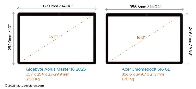 Thunderbolt Aorus Master 16 2025 は、Thunderbolt 5 ポートを備えています。 Chromebook 516 GE には Thunderbolt ポートがありません。