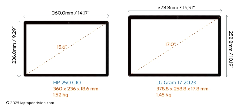 HDMIどちらの 250 G10 と Gram 17 2023 も HDMI ポートを備えています。 250 G10 は 1x HDMI 1.4 を提供し、 Gram 17 2023 は 1x HDMI 2.0 を提供します。