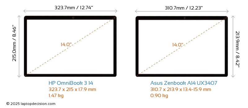 HDMIどちらの OmniBook 3 14 と Zenbook A14 UX3407 も HDMI ポートを備えています。 OmniBook 3 14 は 1x HDMI 1.4 を提供し、 Zenbook A14 UX3407 は 1x HDMI 2.1 を提供します。