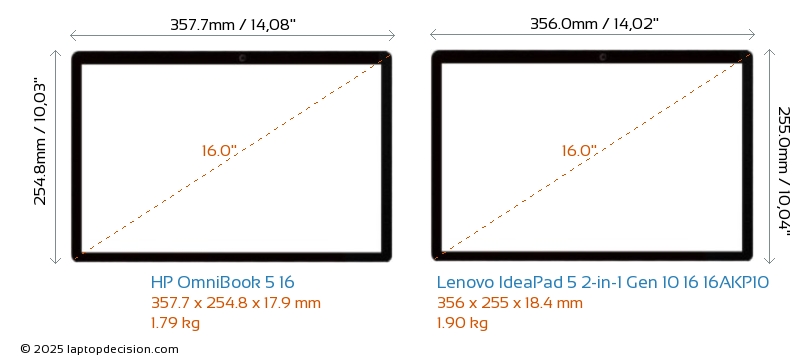 HDMIどちらの OmniBook 5 16 と IdeaPad 5 2-in-1 Gen 10 16 16AKP10 も HDMI ポートを備えています。 OmniBook 5 16 は 1x HDMI 2.1 を提供し、 IdeaPad 5 2-in-1 Gen 10 16 16AKP10 は 1x HDMI 1.4 を提供します。