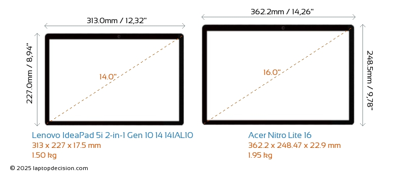 HDMIどちらの IdeaPad 5i 2-in-1 Gen 10 14 14IAL10 と Nitro Lite 16 も HDMI ポートを備えています。 IdeaPad 5i 2-in-1 Gen 10 14 14IAL10 は 1x HDMI 1.4 を提供し、 Nitro Lite 16 は 1x HDMI 2.1 を提供します。