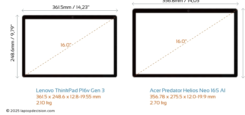 HDMI両方の ThinkPad P16v Gen 3 と Predator Helios Neo 16S AI は、外部モニターに接続するための HDMI ポート (1x HDMI 2.1) を備えています。