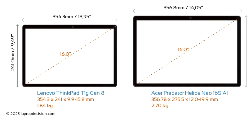 Thunderbolt両方の ThinkPad T1g Gen 8 と Predator Helios Neo 16S AI は Thunderbolt ポートを備えています。 ThinkPad T1g Gen 8 は Thunderbolt 5 を持ち、 Predator Helios Neo 16S AI は Thunderbolt 4 を持っています。