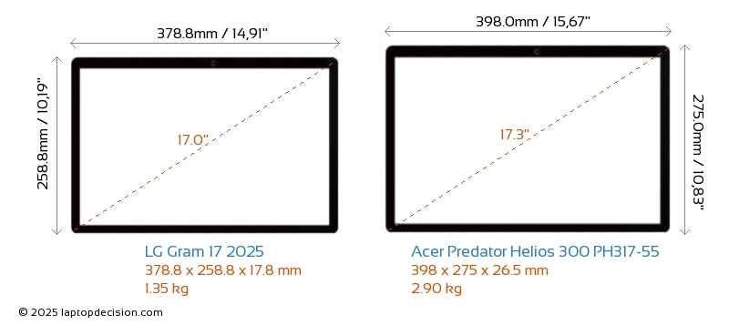 HDMI両方の Gram 17 2025 と Predator Helios 300 PH317-55 は、外部モニターに接続するための HDMI ポート (1x HDMI 2.1) を備えています。