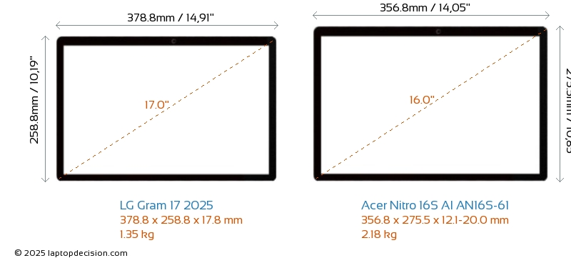 Wifi Gram 17 2025 はより高度な Wi-Fi 規格 v7 を備え、 Nitro 16S AI AN16S-61 (v6E) と比べて、より高速で信頼性の高いワイヤレス接続を提供します。