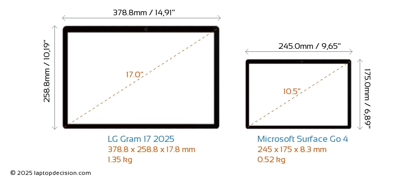 HDMI Gram 17 2025 は、外部モニターに接続するための HDMI ポート (1x HDMI 2.1) を備えています。 Surface Go 4 には HDMI ポートがありません。