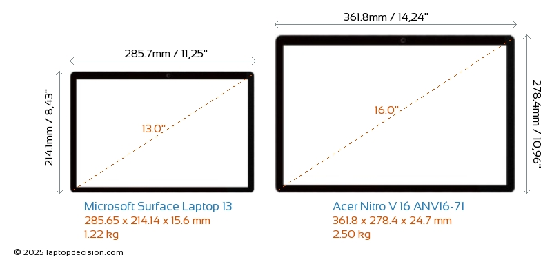 HDMI Nitro V 16 ANV16-71 は、外部モニターに接続するための HDMI ポート (1x HDMI 2.1) を備えています。 Surface Laptop 13 には HDMI ポートがありません。