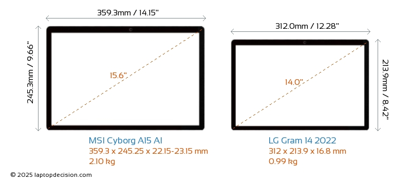 HDMIどちらの Cyborg A15 AI と Gram 14 2022 も HDMI ポートを備えています。 Cyborg A15 AI は 1x HDMI 2.1 を提供し、Gram 14 2022 は 1x HDMI 2.0 を提供します。