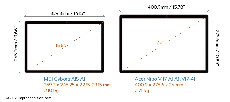 USB両方の Cyborg A15 AI と Nitro V 17 AI ANV17-41 は、USB-A ポートを備えています。 Cyborg A15 AI は 2x USB 3.2 USB-A ポートを持ち、 Nitro V 17 AI ANV17-41 は 3x USB 3.2 USB-A ポートを持っています。両方の Cyborg A15 AI と Nitro V 17 AI ANV17-41 は、USB Type-C ポートを備えています。 Cyborg A15 AI は 1x USB 3.2 USB Type-C ポートを持ち、 Nitro V 17 AI ANV17-41 は 2x USB 4.0 USB Type-C ポートを持っています。