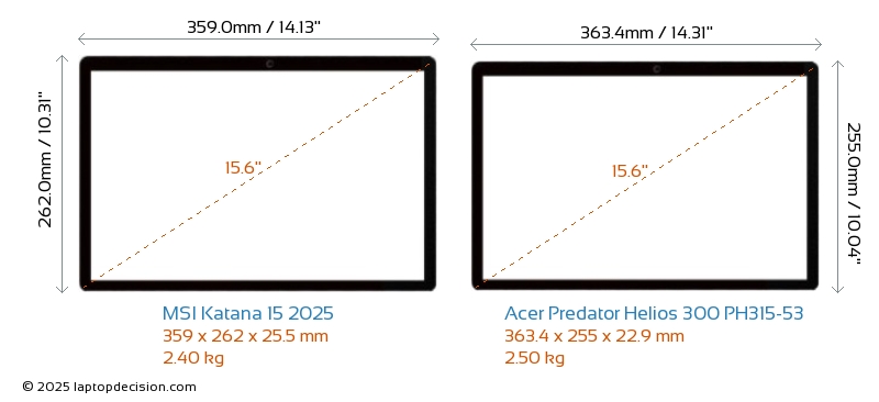 HDMIどちらの Katana 15 2025 と Predator Helios 300 PH315-53 も HDMI ポートを備えています。 Katana 15 2025 は 1x HDMI 2.1 を提供し、Predator Helios 300 PH315-53 は 1x HDMI 2.0 を提供します。
