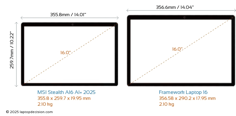 USB Stealth A16 AI+ 2025 は、2x USB 3.2 USB-A ポートを備えています。 Laptop 16 は、USB-A ポートがありません。両方の Stealth A16 AI+ 2025 と Laptop 16 は、USB Type-C ポートを備えています。 Stealth A16 AI+ 2025 は 1x USB 4.0 USB Type-C ポートを持ち、 Laptop 16 は 4x USB 4.0 USB Type-C ポートを持っています。