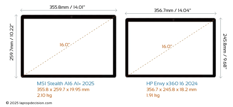 HDMI両方の Stealth A16 AI+ 2025 と Envy x360 16 2024 は、外部モニターに接続するための HDMI ポート (1x HDMI 2.1) を備えています。