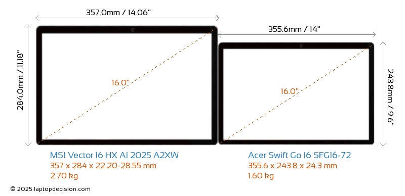 HDMI両方の Vector 16 HX AI 2025 A2XW と Swift Go 16 SFG16-72 は、外部モニターに接続するための HDMI ポート (1x HDMI 2.1) を備えています。