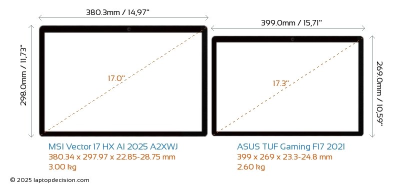 HDMIどちらの Vector 17 HX AI 2025 A2XWJ と TUF Gaming F17 2021 も HDMI ポートを備えています。 Vector 17 HX AI 2025 A2XWJ は 1x HDMI 2.1 を提供し、TUF Gaming F17 2021 は 1x HDMI 2.0 を提供します。