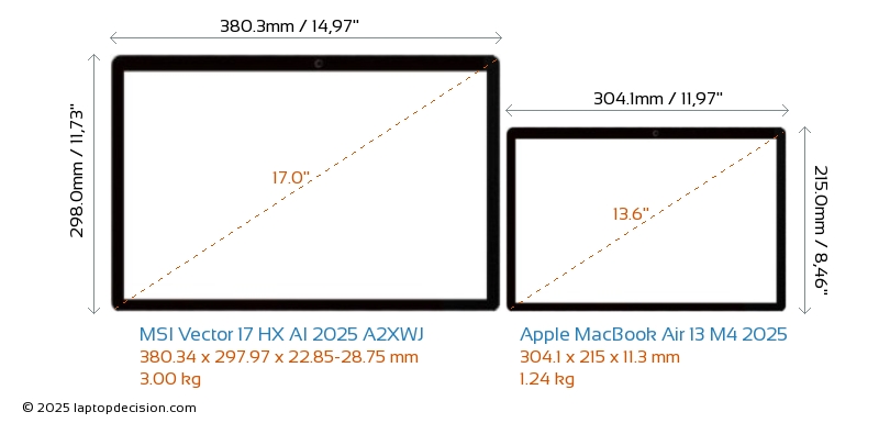 HDMI Vector 17 HX AI 2025 A2XWJ は、外部モニターに接続するための HDMI ポート (1x HDMI 2.1) を備えています。 MacBook Air 13 M4 2025 には HDMI ポートがありません。