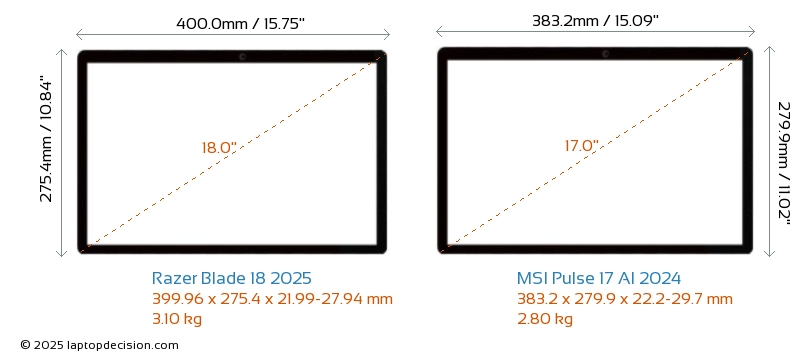 USB両方の Blade 18 2025 と Pulse 17 AI 2024 は、3x USB 3.2 の USB-A ポートを備えています。両方の Blade 18 2025 と Pulse 17 AI 2024 は、USB Type-C ポートを備えています。 Blade 18 2025 は 2x USB 4.0 USB Type-C ポートを持ち、 Pulse 17 AI 2024 は 1x USB 3.2 USB Type-C ポートを持っています。