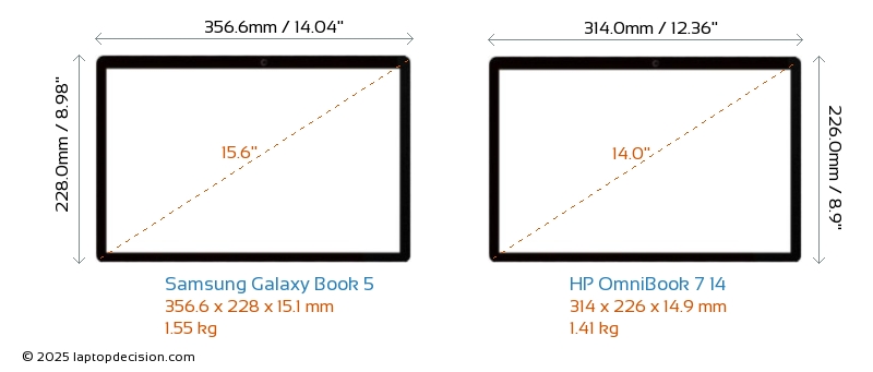 HDMIどちらの Galaxy Book 5 と OmniBook 7 14 も HDMI ポートを備えています。 Galaxy Book 5 は 1x HDMI 1.4 を提供し、 OmniBook 7 14 は 1x HDMI 2.1 を提供します。